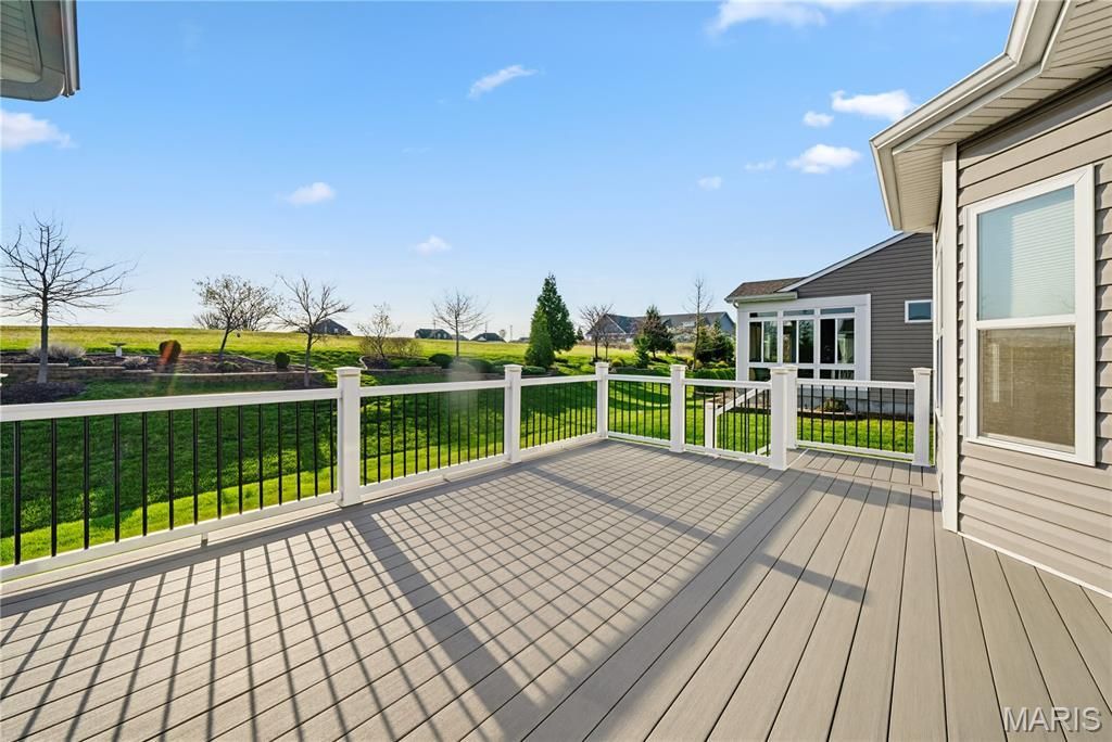 Only 8 years young, this attractive 3-bedroom, 2-bath home in the highly sought-after 55+ community of Heritage of Hawk Ridge blends modern finishes with easy, low-maintenance living. Vaulted ceilings in the main living area create an open, airy feel. The well-appointed kitchen features stainless appliances, a pantry, breakfast bar and quartz countertops. The great room flows into a bright sunroom with abundant windows, and a low-maintenance deck added in 2024 overlooks a lush backyard-perfect for relaxing or entertaining.The spacious primary suite offers a coffered ceiling, bay window and a luxury bathroom with double-sink vanity, walk-in shower and roomy walk-in closet. A convenient main-floor laundry room sits near the primary suite and owners' entry.Enjoy an active lifestyle with community amenities including tennis and pickleball courts, swimming pool, clubhouse, fitness area and golf course access. Ideally located off Hwy 40 and LSL Blvd, close to shopping, dining and entertainment.