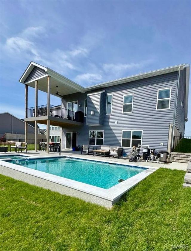 Welcome to 66 River Wind Dr., an exceptional custom residence where refined design meets resort-style living. Situated on a quiet cul-de-sac lot with an extended driveway, this beautifully appointed home offers 3,126 sq ft of living area, elegant finishes, soaring ceilings, and a stunning outdoor retreat designed for both relaxation and entertaining. From the moment you arrive, the custom 8' leaded glass front door sets the tone for the craftsmanship found throughout. Inside, you'll discover an open and sophisticated layout highlighted by 11' ceilings in the great room and 9' ceilings throughout the rest of the home, & recessed LED lighting in every room. The great room serves as the heart of the home, featuring a direct-vent fireplace, integrated ceiling speakers, and seamless flow into the gourmet kitchen. The kitchen is a chef's dream with professional-series stainless steel appliances, 42 soft-close cabinetry, and quartz countertops. Throughout the home, vinyl plank flooring provides both durability and modern elegance, while 8' interior doors on the primary level add to the home's spacious and upscale feel. A private den with double glass office doors creates the perfect work-from-home environment. The primary suite is designed as a private retreat with a tray ceiling and a spa-inspired bathroom featuring dual pocket doors for added privacy and function. The 10' pour walk-out lower level offers expansive additional living space accessed by solid oak steps. A striking oversized vent-free fireplace anchors the lower level that includes a bedroom, full bath, and custom closet, along with an entertainer's dream bar area featuring granite countertops, built-in dishwasher, and ice maker. Step outside to your private backyard oasis. The custom covered 12' x 14' deck overlooks a spectacular gunite in-ground pool and spa, fully controllable from your phone & a spacious patio finished with Sun Deck coating. Additional premium features include a fully insulated and drywalled 4' extended garage, irrigation system, exterior security cameras, plantation shutters throughout & exterior soffit lighting. This home seamlessly blends luxury finishes, modern technology, and resort-style amenities in one of St. Charles' most desirable settings.
